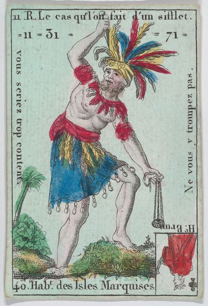 This playing card, "Hab.t du Mexique," was part of a "Jeu d'Or" deck created anonymously, its production shaped by the cultural and political forces of its time. The image presents a romanticized vision of a Mexican inhabitant, complete with indigenous clothing and a rustic setting. The French text framing the image hints at the complex relationship between Europe and the Americas, and colonialism at the time. Produced at a time of increasing cultural exchange and colonial expansion, playing cards like these became a tool for disseminating information and shaping perceptions of distant lands and people. The inclusion of a Mexican figure in a deck of playing cards speaks volumes about the growing awareness of, and perhaps fascination with, the Americas in European society. To fully grasp the significance of this playing card, we need to examine the historical context in which it was created, using resources such as trade records and colonial archives. In doing so, we appreciate how art objects like this became vital players in the game of cultural representation and exchange.