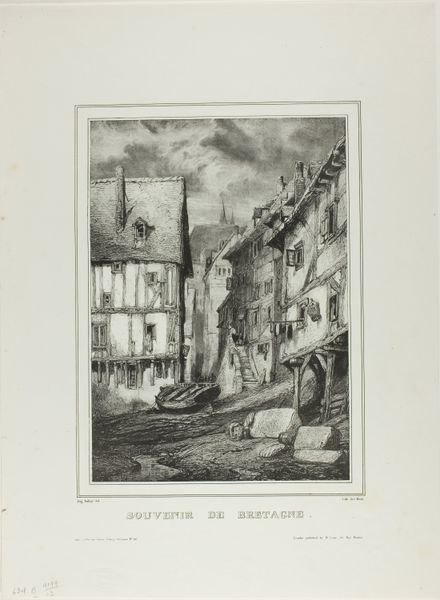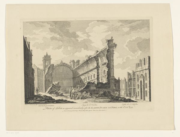 Editor: This is "Gezigt op de ruïne veroorzaakt door den brand te Middelburg," created in 1857 by Albertus Anthonius Nunnink, employing watercolor and print techniques. The scene depicts the aftermath of a fire in a city. What draws my eye is the contrast between the intact buildings and the skeletal remains of those ravaged by flames. What do you make of the composition here? Curator: Observe how the artist segments the scene. The crisp architectural facades and townspeople give way to the charred remains, which themselves have a stark geometric structure despite the chaos of the event. Nunnink guides your eye to the devastation not only through content, but formal juxtapositions. Consider the pale, almost ghostly hues he employs. How do the cool colors influence our reading of the print? Editor: It does seem to mute the impact somewhat. Rather than a scene of violent destruction, it feels more like a somber reflection. The light palette shifts our attention away from the dramatic qualities towards a focus on the more mundane: the onlookers, the buildings in the distance. Is this a work intended more to record than to evoke an emotional reaction to this devastation? Curator: Precisely. The print achieves a measured balance. Note that while the devastation sits centrally, our perspective emphasizes linearity: rows of buildings, parallel supporting beams – rational, structural, measured responses to what is usually deemed chaotic. This tension gives the work resonance and a remarkable stoicism. Editor: I see it now; the arrangement is carefully orchestrated to create an impactful contrast, rather than focusing solely on a sentimental depiction. I learned to look beyond the theme toward visual decisions made. Curator: Agreed, and in doing so we apprehend an enriched view of its intended significance.