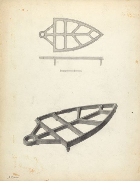 Curator: This is a drawing entitled "Trivet," created by Charles Garjian around 1938. It's rendered in pencil on what appears to be aged, toned paper. Editor: It has such a sparse, almost utilitarian feel, doesn't it? The lines are simple, clean, but also kind of somber given the aged paper. Curator: Precisely. Garjian's piece reflects a very specific period of American art. There was this desire to capture the dignity and purpose of even the most ordinary objects during an era marked by economic hardship. Editor: So, elevating the mundane almost becomes an act of resilience, right? I'm also struck by how he's chosen to represent the trivet in stages. Like an exploded diagram—presenting its various parts from different perspectives on a single plane. Curator: Yes, it suggests the intersection of functionality and the design ethic of the time. You know, mass production and the machine aesthetic impacted artistic renderings of everyday objects. Editor: It is interesting. The stark simplicity emphasizes a pre-digital understanding of practical design. Thinking about our relationship to manufactured things, it's harder now to see this level of... quiet consideration, you know? Curator: The trivet, traditionally, protects surfaces from heat, bearing the brunt of use and labor. The artist presents a study in form. In essence, this trivet design, even on paper, exists because we as a society deem labor worth doing, sustaining the practice of eating or gathering around shared warmth and care. Editor: Definitely a point well taken. It reframes what looks like just a functional sketch into something so much larger. It’s a visual meditation on use, labor, and societal sustenance all wrapped into this understated design. A compelling thing, the political weight held within ordinary object drawings like this. Curator: Agreed. This glimpse into everyday life can invite questions of how art reflects both the spirit and function of its society. Editor: I leave here thinking about the beauty of everyday life, even in its simplicity. Curator: And perhaps, finding value and durability within functional things can serve as its own subtle and satisfying declaration.
