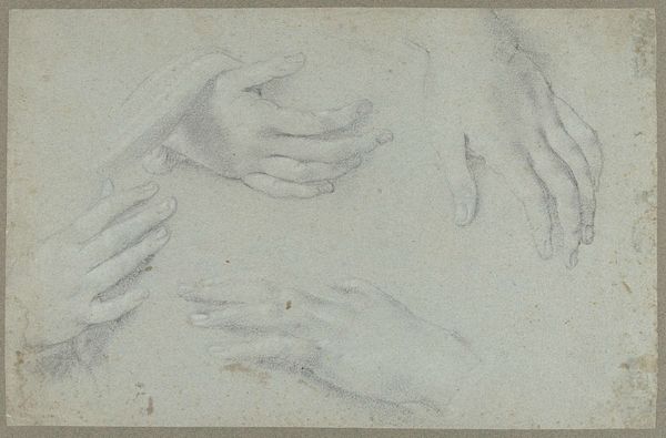 Editor: This is “Etude de quatre mains,” a charcoal drawing by Luc-Olivier Merson. It’s essentially a study of four hands in various positions. What immediately strikes me is how realistically he captures the subtle gestures, but there's something more here, almost evocative. What do you see in this piece? Curator: I see hands carrying echoes. They are our primary tools, the means by which we not only manipulate the world but also express ourselves, building a profound visual link to those who came before us. Consider the symbolic weight of the hand across cultures—from benediction gestures in religious iconography to the power symbolized by a king’s hand holding a scepter. Even seemingly mundane studies, like these, evoke the continuity of human experience, of skill and labor passed down. Does the drawing style remind you of earlier practices? Editor: Yes, absolutely! It looks classical, almost like a Renaissance study, especially with the brown paper. Are the positions of the hands significant, do you think? Curator: Each pose, though a study of form, also hints at action, potential. A hand outstretched is different from a clenched fist. Do you find your mind creating narratives, stories, based on the implications of each gesture? The hands are tools but are also are filled with intent. Editor: I do. I see the possibility of grasping, maybe a caress or command... they do trigger associations in my mind. It's funny; I came to this just thinking about form, but I hadn’t really considered the symbolism until now. Thanks! Curator: And for me, reflecting with you highlights how much cultural meaning rests even in these preparatory sketches. Every carefully observed detail subtly resonates with a history of shared meanings.