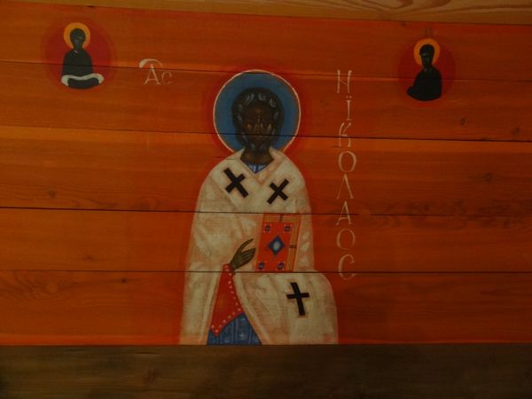 Curator: Here we have Jerzy Nowosielski's striking rendition of "St. Paraskeva," a tempera painting rendered on wood panel. What's your first impression? Editor: The raw quality of the wood makes an immediate impression. I appreciate its rustic nature and how the horizontal lines seem to disrupt what otherwise would be a simple devotional portrait. It’s almost as if she is breaking free of a constructed, material world. Curator: Precisely! The choice of the wood is critical. Nowosielski deliberately chooses humble materials. The rough, unfinished quality of the wood makes it feel closer to folk art, thus bringing into question ideas of "high art" by situating devotional art in dialogue with everyday production. How might its textural composition intersect with our understanding of gender and labor? Editor: I see what you mean, thinking about where and who it was that harvested this material—especially in consideration of women’s work and devotional labor. In my mind, her expression, though stylized, evokes both strength and sorrow, a kind of stoic resolve familiar from many Eastern European Orthodox traditions. And in terms of labor, I see this piece opening questions about representation: Who has the authority to represent holy figures and whose visions are valued? Curator: Her black visage certainly deviates from the traditional iconography and makes me question not just the role of artistic labor, but racial identity and power as well. The red halo, so cleanly rendered, is another aspect where his unique tempera applications stand out. How do you view the political implications, considering the time period? Editor: Knowing that Nowosielski worked in post-war Poland under Soviet influence provides another layer of context, a place and time that actively worked to regulate artistic and religious expressions. By utilizing visual vocabulary and materials linked to popular culture, he creates a compelling visual and political statement about identity and cultural preservation. Curator: Absolutely. It becomes clear that even in ostensibly 'religious' art, the choice of medium and execution carries considerable political weight. His "St. Paraskeva" demonstrates that the boundaries of art extend far beyond mere representation. Editor: Yes, seeing the painting within its historical, social, and material context enriches my understanding, encouraging questions of cultural appropriation and spiritual transformation that really make the work resonant even today.