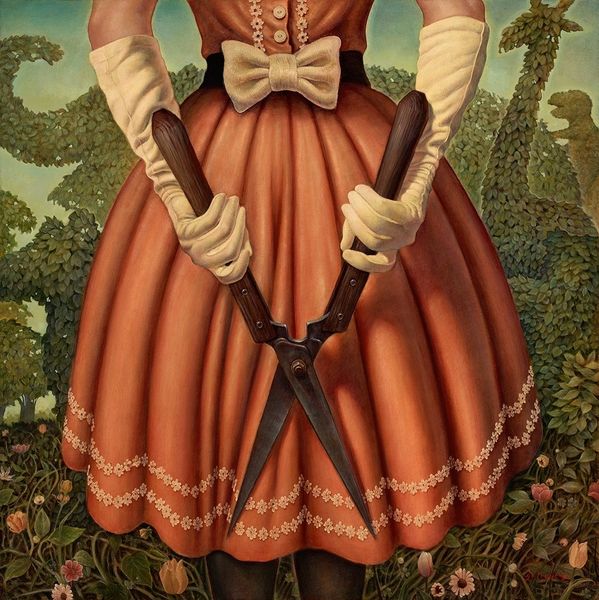 Michael Cheval painted "Honesty," probably with oils, conjuring a dreamlike vision where the familiar becomes wonderfully strange. Look at the woman’s poised expression, and the way the red of her dress pops against the green background. This work is a testament to the power of color to evoke feeling. The painting feels smooth and considered; there are no brushstrokes here to give the game away, to tell us how it's done. The lack of texture gives it a surreal quality; the woman is there, but she is also not there, like a figure in a dream. And there, in the background, what is that hidden face? It is like a half-formed thought, lurking, watching. That face is the key, the thing that opens up the painting. It is what turns a competent portrait into something strange and surreal. Cheval reminds me of Magritte, in the way that he borrows from the tropes of traditional painting to create a riddle. Like Magritte, Cheval is interested in the ambiguity of images, and the multiple ways of interpreting the world.