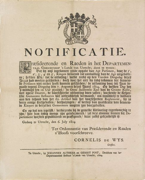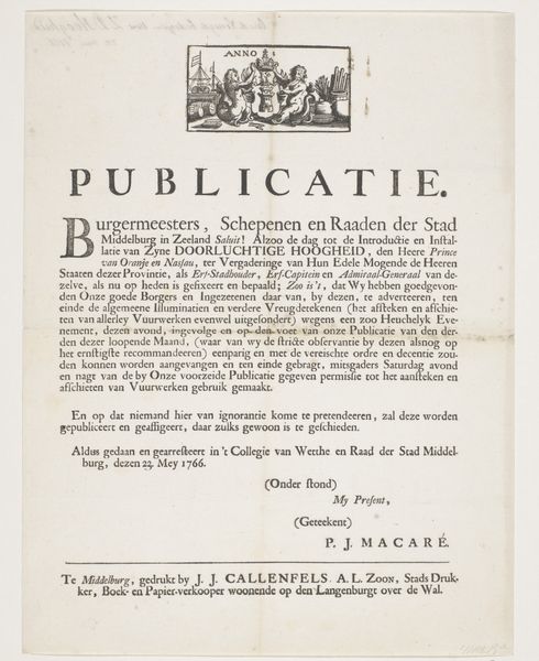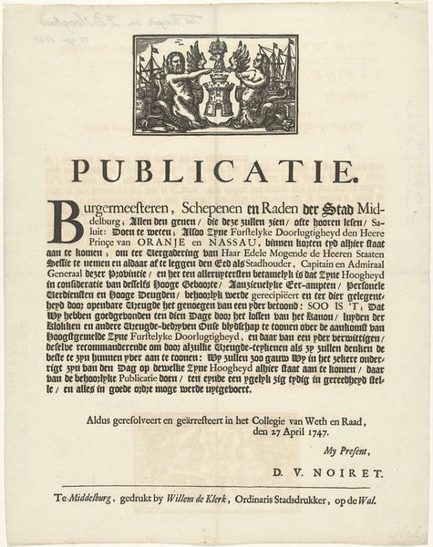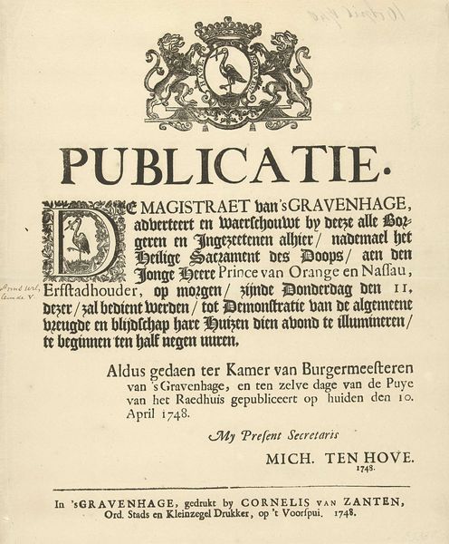 This printed announcement by Cornelis van Zanten, made in 1748, commemorates the birth of Prince William V. Dominating the page are heraldic symbols: rampant lions and what appears to be a heron or stork in the crest. These are more than mere decorations. Lions, for centuries, have represented courage, nobility, and royalty. The bird may symbolize good luck and fortune, as in ancient times, storks were harbingers of spring and new life. Similar symbols echo throughout European art and history, like lions guarding palace gates from antiquity to the Renaissance. Consider how in ancient Egypt, the heron, or Bennu bird, was associated with rebirth. Here, on this Dutch announcement, we see the recurring motif of hope and renewal, deeply ingrained in our collective psyche. The birth of a prince is not just a personal event, but a resurgence of the state itself. This imagery, triggering primal emotions, binds the viewer to the historical moment, reminding us that history is not linear, but a continuous cycle.