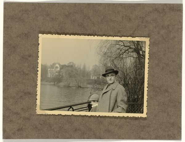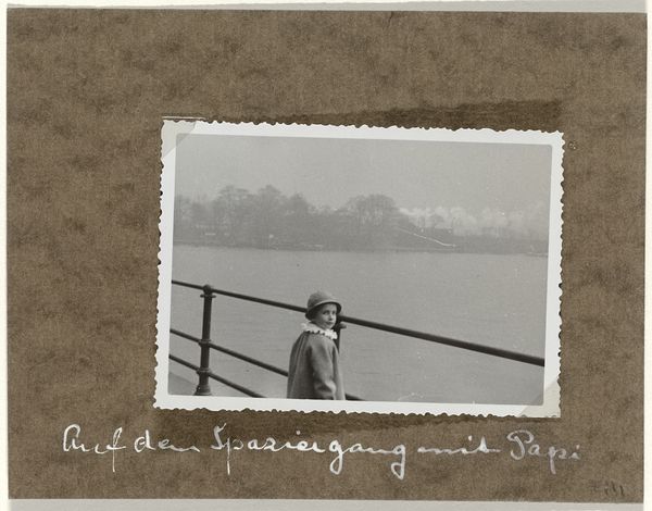 Editor: Here we have a gelatin silver print, "Isabel Wachenheimer aan de rivier de Alster tijdens het bezoek van Isabel Wachenheimer aan haar oom Willy Moos in Hamburg," likely from 1935. It's a little girl overlooking a misty river. There's a wistful, almost melancholy feeling to it. What do you see in this piece? Curator: Immediately, I see layers of visual encoding at play here. A portrait embedded within a landscape evokes cultural memory and identity. The child is clearly positioned within the frame and almost pressed up against a man-made barrier. It seems like a gate, a permeable object – where does that divide exist on the landscape itself? It presents the viewer with a choice: a young child caught between worlds or possibilities. Editor: Caught between worlds? That's an interesting take. Can you elaborate on that idea of worlds? Curator: Of course. Look at how the blurred background seems to blend earth and sky into one plane. It symbolizes transience, uncertainty, especially considering this was captured perhaps on the eve of the second World War, but this is balanced by a stable foreground of both a young girl, and some fencing that gives a sense of home or safety. The Alster River takes on added weight: Is it freedom, escape, or perhaps simply oblivion, in relation to the life the young woman is expected to lead? Even her gesture of pointing, her future, is caught between those signs. Editor: I never would have seen all of that on my own. Curator: The power of images lies precisely in this multifaceted potential, this dialogue with symbols we create. Editor: Well, thanks to you, I definitely have a richer understanding of this photograph now. Curator: Likewise, it's a reciprocal exchange.