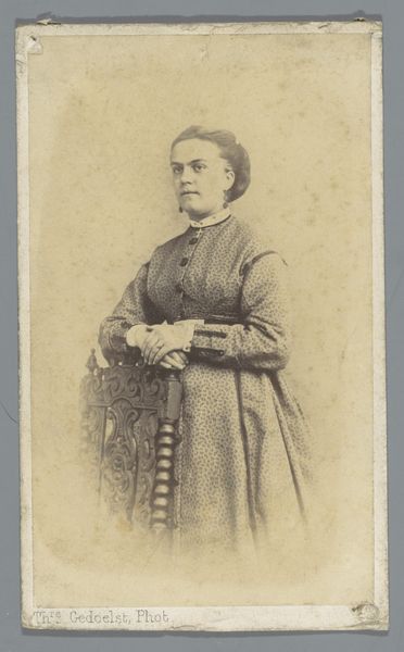 Editor: This is "Portret van een onbekende zittende vrouw," by Willem Carel Heijenberg, dating from 1872 to 1882. It’s a striking photographic print on paper. There's a formality and gravity to it that’s characteristic of portraiture of the time. How might you interpret this photograph? Curator: Focusing on the material aspects, it's crucial to recognize that in the late 19th century, photography was rapidly evolving as both an artistic medium and a commodity. The production of such portraits democratized representation. Note the type of paper used, the toning process-- how do those material choices shape the overall aesthetic and communicate social standing? This wasn't simply about capturing an image. What does the sitter's clothing convey in the context of Victorian manufacturing? Editor: So, beyond just a pretty picture, you’re seeing the photo as a product of the time period’s industry? How does it challenge art and craft, then? Curator: Precisely! It challenges conventional notions of high art by highlighting the industrial processes involved. Look at the clothing she wears; it implies factory production in a growing global marketplace. This bridges the gap between artistic portraiture and the larger industrial, consumerist structures. It makes us confront mass production rather than artistic handiwork. What does mass production of that fabric signal? Editor: Hmm, I hadn’t thought of it that way before. It does point to the increased availability of goods and a developing consumer culture. And you see that embedded in this formal portrait! Curator: Yes, these early photographs present us with insights into the commodification of images and fashion. We see the labor involved in making both the photograph and what the sitter is wearing. That material relationship, right down to the specific chemicals used to develop the image, is core to understanding this piece. What assumptions can we begin to unravel by exploring this? Editor: This gives me a lot to think about. I definitely see the portrait as part of the economic and social fabric of the late 19th century now, beyond its aesthetic qualities.