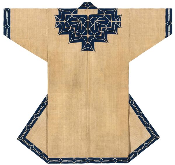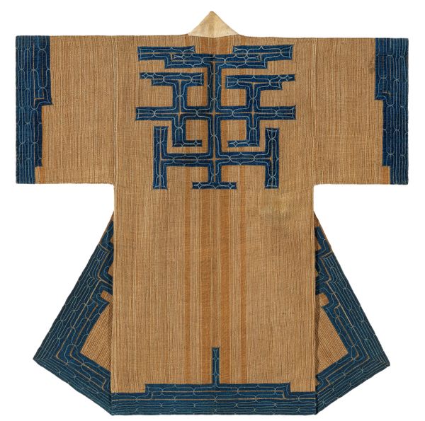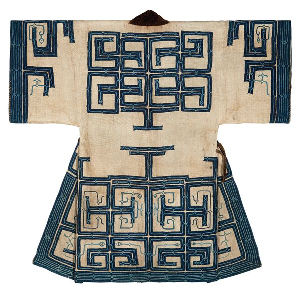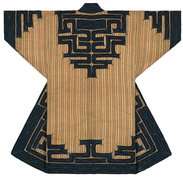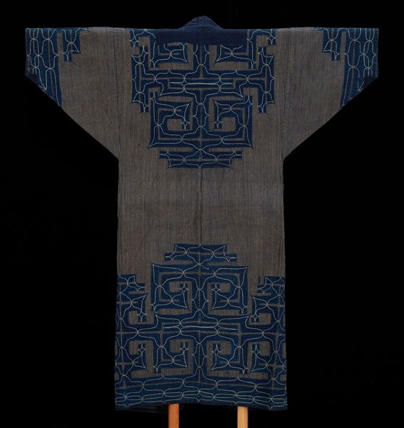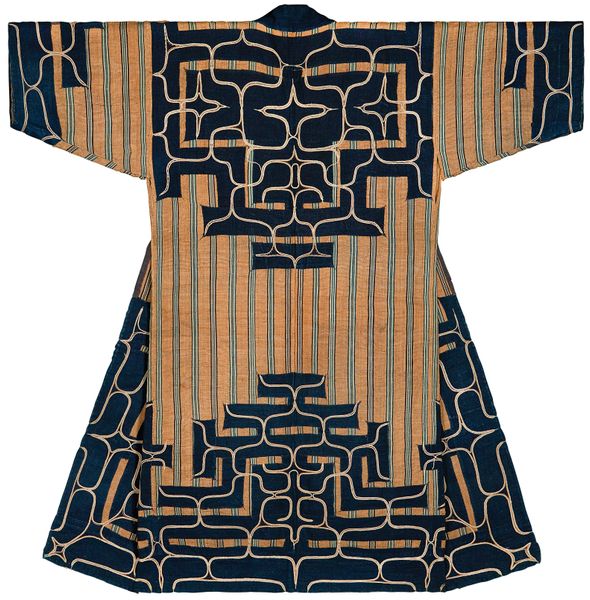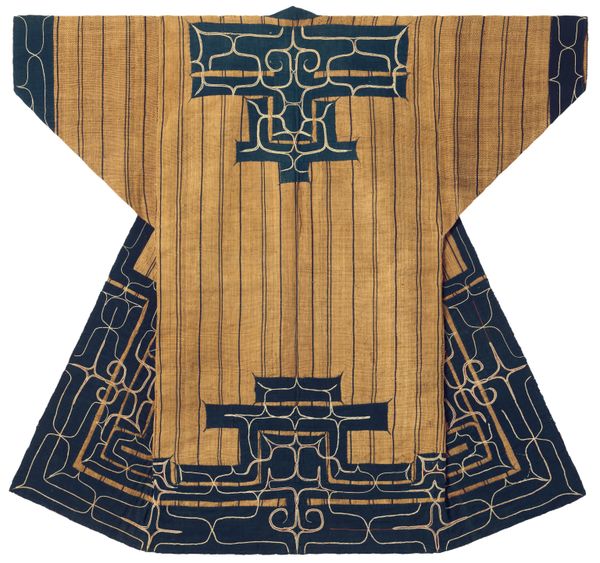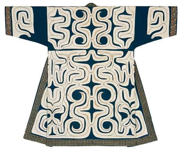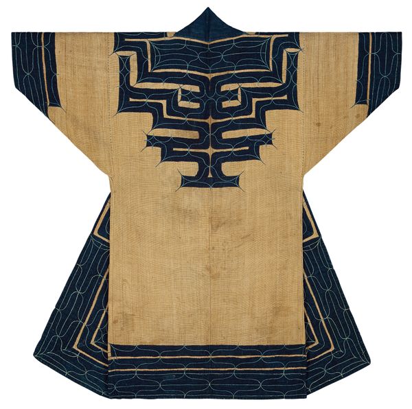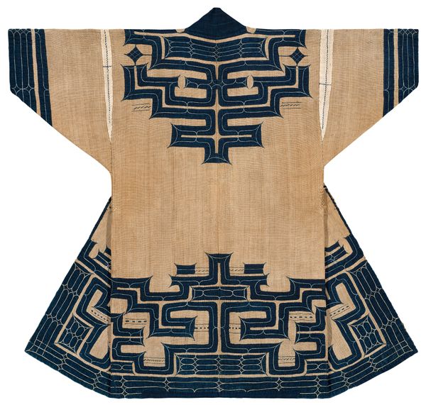 Curator: Look at the incredible textile work in front of us: this is an Attush robe, created in the late 19th century, currently residing here at the Minneapolis Institute of Art. Editor: Immediately, the geometry grabs me. The strong contrast between the tan base cloth and the bold indigo dye really makes those swirling motifs pop. There’s something very graphic about it, almost modern. Curator: Indeed. We can analyze it from its materials: it’s a woven textile, but beyond just utility, it also signifies social status. These robes were often worn by the Ainu people of northern Japan during important ceremonies. It moves beyond 'just a robe' and makes itself culturally relevant. Editor: Right, it is vital to contextualize this robe within the complex history of Ainu culture. We should also remember their marginalization within Japanese society, which certainly shaped the creation and, arguably, later presentation of items like this in Western museum settings. How does it make the robe more than just a textile object to the community it belonged to? Curator: Precisely. The process and material here—weaving and the natural dyes used—become more important than any surface-level aesthetic. You are witnessing not only artistry, but hard labor, specialized knowledge passed down through generations, and also access to certain material resources. It is less the 'art' and more a demonstration of life. Editor: And it is these complexities, this push and pull between craft, status, identity, and political history that truly resonates when engaging with such a powerful garment. Seeing it here also pushes me to remember the path that such an object takes as it changes hands. Curator: Absolutely. When we consider the means and the history behind something, it changes the lens on the whole creation. It gives new context. Editor: Definitely. Approaching an artwork this way highlights the layered cultural importance imbued within its creation and exhibition. It encourages us to appreciate it not just for its aesthetic qualities, but its history.