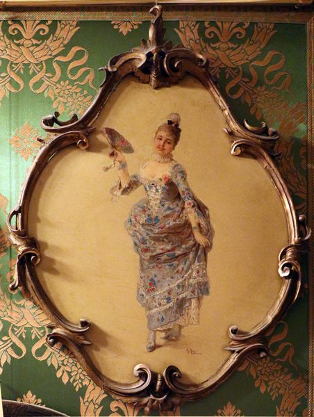 Curator: Stepping back, the immediate impression is one of elaborate formality. There’s such palpable weight, visually and probably politically. Editor: Indeed. This is a portrait by Francesc Masriera, titled *Portrait of Queen Regent Maria Cristina and King Alfonso XIII*. It's an oil painting. Notice the young king, his stature diminished by his mother’s regality, and the bronze bust mirroring his eventual authority. What can we unpack about this image? Curator: Well, immediately the overt display of power is difficult to ignore. The Queen’s dress alone is practically an armour of wealth and status. But it also speaks to the specific construction of female power in that era—ornate, performative, and entirely reliant on male lineage. Editor: Precisely. This painting is, in essence, a very carefully constructed piece of political propaganda. It’s designed to project an image of stability and legitimacy during a turbulent period. How interesting that we see the tools used to fashion perception here—dress, bearing, crest, future symbol of power in the bust! Curator: It does lead me to consider the implications of the young King's placement—positioned so close to his mother, overshadowed in stature, even physically leaning towards her for support. There's something incredibly compelling about this presentation of inherited authority and the inherent fragility of leadership in childhood. I question the ways his narrative gets absorbed. Editor: That push and pull between private vulnerability and projected public strength are what makes this portrait so fascinating. We're seeing not just individuals, but institutions and all the fraught narratives they carry. Curator: The symbolism, even down to the branch he’s holding…the promise of peace offered by a child sovereign, I assume? There is a vulnerability and burden reflected back on us. Editor: Perhaps. What a brilliant painting to remind us of both the visual vocabulary of power, and the weight such imagery exerts on identity, especially when that identity is just forming.