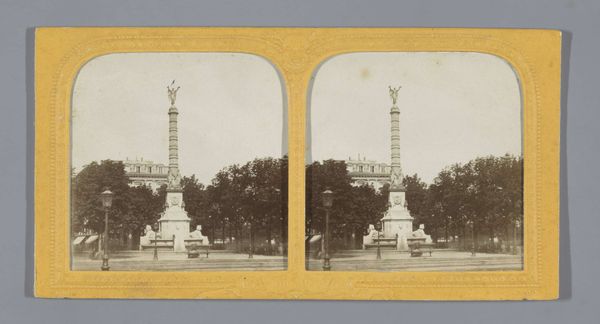 Editor: So, this gelatin-silver print shows Trafalgar Square in London, and it was created by the London Stereoscopic Company sometime between 1854 and 1880. I’m immediately drawn to the formality and orderliness of the composition. It feels almost… staged. What do you see in this image? Curator: Immediately, I'm captivated by Nelson's Column, that imposing vertical reaching skyward. It acts as a potent symbol of British naval power and national identity. How do you think its prominence affects our reading of the scene? Editor: Well, it definitely commands attention. I guess it suggests a sense of pride, maybe even dominance. But what about the other elements, the buildings, the people, the square itself? Curator: They whisper stories of daily life and societal structures, right? Think about what a stereoscopic image offered the viewer. Beyond simply seeing a photograph of a place, they were being invited to possess a version of it, a simulacrum they could hold in their hands. The monument towers over what are surely tiny human figures going about their daily business, but the photographic method itself brought an implied democratization of imagery for the burgeoning Victorian middle class. Is that making sense? Editor: Yes, absolutely! The stereoscope essentially made London more accessible, like a souvenir, and maybe flattened its identity for easier consumption. Curator: Precisely. That column, that Square, transformed into consumable symbols. What has this sparked for you in thinking about how images, especially of monuments, take on iconic meaning? Editor: It's making me think about how a single image can be both a representation of reality and a powerful construct, shaping and reinforcing cultural narratives. It really demonstrates how intertwined national identity is with visual culture. Thanks!