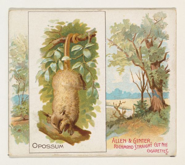 Editor: This is “Armadillo, from Quadrupeds series (N41) for Allen & Ginter Cigarettes,” made around 1890. I’m fascinated by this little card from a cigarette pack. There's a quirky, almost whimsical quality to it. What strikes you most about it? Curator: It's that collision of worlds, isn't it? High-end tobacco advertising adopting Japonisme, with these almost dreamlike background vignettes and, smack dab in the middle, the armadillo, beautifully rendered with colored pencil, grounded in this exotic flatness, which I always find delightful. The cigarette card itself is a testament to a different era of visual culture, what are your thoughts? Editor: Definitely! It feels like a mini-encyclopedia entry and an exotic vacation all rolled into one tiny, cardboard rectangle. But is the juxtaposition intentional, do you think? Is it just about appealing to a refined sensibility while also pushing the boundaries of visual presentation, with each layer sort of telling a different story about commerce and exoticism? Curator: Precisely! The layered approach draws me in. Allen & Ginter catered to the aspirations of their customers, a refined aesthetic, international appeal, hints of adventure and knowledge...a symphony of subtle touches and the power of dreams, I suspect! Did you see that tropical vegetation on the lower-left panel that surrounds the focused armadillo portrait? Editor: Yes, I did, those panels really adds to that feel, it's more than an add! I initially perceived as decorative filler but it serves more like visual seasoning that elevates it to something captivating, the more you dig in the more it has something to say! Curator: Agreed, a conversation starter! I learned more about late 19th century commercial aesthetics and its visual nuances while looking at this little piece. What about you? Editor: For me, understanding the confluence of commerce, art, and cultural influence, from such a tiny card has left an imprint, to remind that beauty and expression could be anywhere and everywhere.
