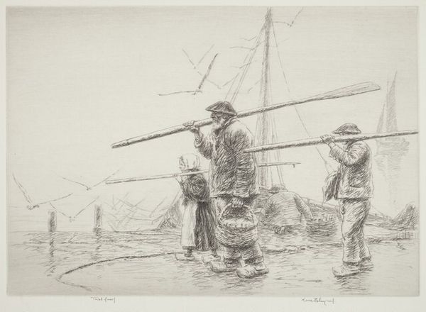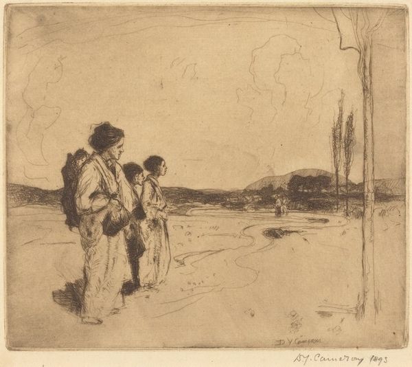 Editor: This is James McBey's 1920 etching, "The Surrender of Jerusalem." The sepia tones give it a rather somber, contemplative mood. Two soldiers stand in the foreground, gazing towards the city in the distance, with what looks like another group approaching to surrender. What strikes you about it? Curator: What interests me is how McBey depicts a key historical moment - the British entry into Jerusalem during World War I - not as a triumphant conquest, but through the eyes of the ordinary soldier. It raises questions about how such events are portrayed and remembered. Consider the social context: Britain's imperial ambitions, the war's impact, the changing perceptions of heroism. Editor: So you're saying it’s less about glorifying the event itself and more about… Curator: …more about understanding the cultural impact, yes. Notice how the scale of the city diminishes in comparison to the soldiers; its a very specific composition. And its style, "Realism", lends a sense of authenticity, prompting the viewer to reflect on the complexities of war and its portrayal. Who tells the story matters, right? Editor: Definitely. It makes me think about the political undertones that might be subtle here, but prevalent elsewhere. Curator: Exactly. Art often plays a vital role in shaping collective memory and national identity. This piece, by focusing on individual experience amidst a historic event, engages us to consider our relationship with history. Where are these images today? Who curates them? And to what purpose? Editor: I hadn't considered it in quite that light before. I see now how historical events get packaged for public consumption and the effect that curation and image selection have on our cultural memory. Curator: It's all part of a continuous dialogue shaping and being shaped by society itself. Always interrogate the narratives.
