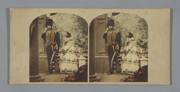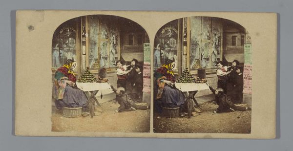 This hand-colored stereo card depicts a street magician, conjuring spectacle for a diverse crowd. Without knowing the artist or precise date, we can still place the photograph within a broader social and cultural context. Stereo cards like this one were a popular form of entertainment in the mid-to-late 19th century, offering a glimpse into far-off lands, historical events, and, as here, everyday life. The figures in the photograph, from the magician with his props to the onlookers in their various states of dress, offer a staged view of social classes. The backdrop, with its sign reading "Exhibition," suggests a deliberate framing of the scene, turning the street into a temporary stage. Understanding this image requires considering the rise of photography as a tool for documenting and shaping social realities. Scholars of visual culture have explored how such images both reflected and reinforced existing social hierarchies. By examining photographic archives, we can uncover the complex interplay between art, entertainment, and the construction of social identity in the 19th century.