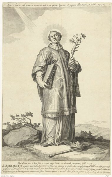 This engraving of Saint Suitbert of Teisterbant was made by Frederick Bloemaert around 1640. Bloemaert was part of a family of artists working in Utrecht during the Dutch Golden Age, a period marked by economic prosperity, artistic innovation, and also the brutal realities of the Eighty Years' War. Suitbert was an Anglo-Saxon missionary who brought Christianity to parts of what is now Germany in the 7th century. Bloemaert’s image, however, reframes Suitbert’s identity through a 17th-century Dutch lens. He is pictured in full Catholic regalia—a deliberate choice during a time when the Dutch Republic was predominantly Protestant. Bloemaert's portrayal is thus not just a depiction of a historical figure, but also a statement on the ongoing religious and political tensions of his time. It invites us to reflect on how historical narratives are constructed and used to address contemporary issues, and how identity, especially religious identity, is negotiated in times of conflict.