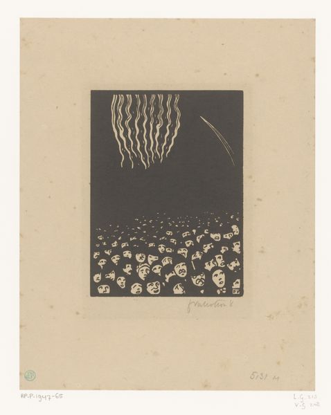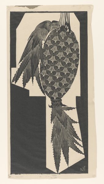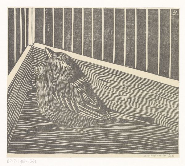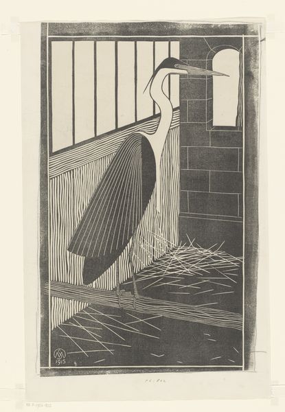 Curator: The work before us is "Rosékaketoe," a woodcut made in 1917 by Samuel Jessurun de Mesquita. The stark contrast between the black ink and the paper immediately captures the eye, doesn't it? Editor: Indeed. There’s a sense of confinement that strikes me first—the dense vertical lines almost cage the bird, yet its very simplified form seems quite jovial. Curator: Precisely. The lines serve multiple formal purposes: they create a spatial framework and delineate the negative space, and they amplify the texture of the bird’s plumage, almost as if we were running our fingers through its feathers. Notice how the direction and length of the lines create subtle tonal variations. Editor: Yes, and if we think about woodcut as a printing technique, each of those deliberate cuts would be arduous to execute. Consider also the social position of de Mesquita in early 20th century Amsterdam, teaching graphic arts to a new generation; these sorts of accessible, stylized illustrations brought attention to new possibilities within older mediums. Curator: That’s a salient point. Further, consider the graphic language. The simplification of the bird into almost a caricature calls into question representation itself. Is it a kaketoe, or is it a symbol of a kaketoe? The structural components overshadow mimetic representation. Editor: In focusing on craft, on this older technique as labor and industry, do we challenge ideas about an elitist artistic milieu in which only oils, marble, and bronze count? And where do our biases sit here, with regard to this sort of historical conversation between applied and fine arts? Curator: Your questions expose the dialectic beautifully. Mesquita masterfully exploits the planar surface and line to explore volume and dimension, while questioning the accepted hierarchies in creative output. The limitations of the material offer freedoms—in texture, and symbolic content—for further interpretations. Editor: I’m struck, thinking about the labour involved, at how our exchange today might refocus critical ideas about artistic value. Curator: Yes, by seeing through different lenses, new patterns emerge.