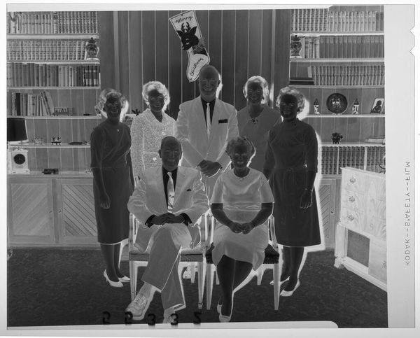 Curator: This is an untitled photograph by Hamblin Studio, currently held in the Harvard Art Museums, depicting a small group gathered around a birthday cake. Editor: The stark inversion of tones creates a surreal, almost ghostly atmosphere. There is a fascinating interplay between light and shadow across the subjects and the room. Curator: Indeed. These studio portraits played a significant role in shaping family narratives, offering a visual record of milestone events like birthdays and solidifying social bonds within communities. Editor: The formality of the poses and dress contrast sharply with the casual intimacy suggested by the birthday celebration itself. It's a fascinating tension that complicates any singular reading. Curator: Absolutely, and the photograph serves as a material artifact through which we can explore the dynamics of power, class, and representation embedded within such seemingly simple family photographs. Editor: It prompts you to consider the layers of meaning infused in this very personal event, now seen from a distance through inverted tones and the lens of history.