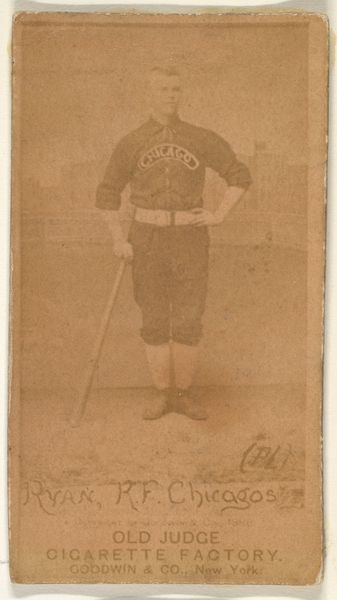 Curator: Here we have a fascinating artifact, a baseball card featuring Ervin Duane "Jim" Curtiss from 1889. It's part of the Old Judge series, produced by Goodwin & Company, known for their cigarette brands. Editor: It's incredible how this small photographic print evokes such a sense of nostalgia, isn't it? The sepia tones and slightly blurred image give it a unique aura. Curator: Absolutely. These cards weren’t just about baseball; they offer insights into the late 19th-century's popular culture and the burgeoning commercialization of sports. It reveals not just Curtiss as an athlete, but the era's values associated with athleticism. Editor: Note the stark contrast between the dark uniform and light background, effectively isolates the figure. The subject is almost caught mid-motion with that tilted gaze that draws our attention to his firm grip on the bat and evokes ideas about focus and force. Curator: Exactly. And consider the Old Judge Cigarette Factory branding. Tobacco companies strategically aligned themselves with sporting heroes, tapping into aspirational ideals of strength and success, especially appealing to a working-class male audience. Editor: Interesting how the very structure of commercial branding can be used to propagate narratives of national pride and even idealized masculinities. However, I wonder if we can look at it less analytically? What feelings do we derive from viewing this piece? Curator: This makes me think about baseball as a distinctly American construct, intimately entwined with capitalism, commodification of sports, gender roles, and mass advertising, that makes it a complex and problematic part of U.S. history. Editor: Still, regardless of social factors, it manages to stir some feelings that connect to more profound aesthetic or emotional responses such as admiration, a sense of yearning for another place and time, a meditation on time. It's a unique paradox. Curator: I see your point. Looking at this piece offers me a different perspective on the concept of cultural memory as it reminds us how advertising shaped and reflected societal attitudes towards sport and consumerism. Editor: Yes, a unique dialogue indeed! We come away from this baseball card now reflecting more about cultural significance and art appreciation itself than a game.
