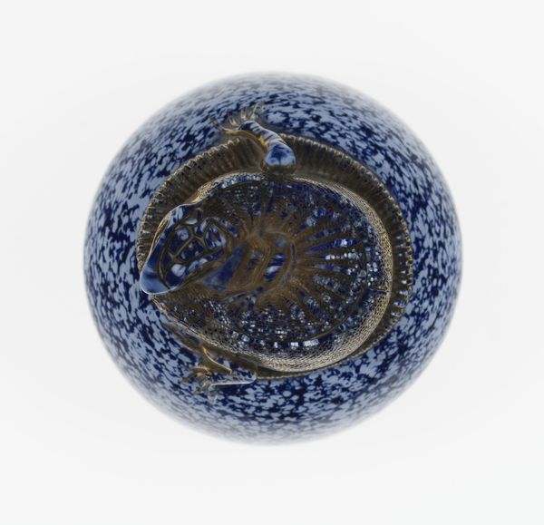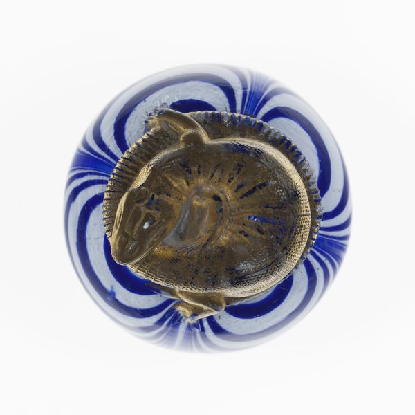 Curator: Standing before us is the glass paperweight crafted by Compagnie de Saint Louis, sometime between 1845 and 1860, presently held in the collection of the Art Institute of Chicago. Editor: It's a striking orb, the cobalt blue mottled with what seems like a sky full of faint stars. There's something unsettling though, in the intricate gilded structure encircling…is that a lizard? Curator: Indeed, this piece encapsulates several cultural anxieties of its time, revealing how the natural world was being both coveted and subjugated. Paperweights, popularized during this era, became fashionable status symbols for the bourgeoisie. Editor: So it's about control, domesticating wildness into an object, then trapping it within this…iridescent, speckled prison? The circular frame emphasizes this idea. It feels incredibly oppressive. Curator: Absolutely, but consider the context of rapid industrialization. The elite used objects such as these to create visual distance from the ecological implications of encroaching modernity. This exotic reptile represents a lost innocence of untouched landscapes. Editor: Lost or contained, wouldn't you say? Visually, I can't escape the texture, the way light catches within that metallic frame is quite intriguing. The scales are almost perfectly mimicked. I can understand the appeal in capturing such a thing. Curator: These kinds of commissioned items from the French glass factories reflected a wider appetite for exoticism tied directly to imperial endeavors, which carried distinct racial and social inequalities. Owning this signaled cultural prestige as much as individual refinement. Editor: It's true; the formal qualities betray darker currents. All that ornate beauty feels deeply compromised when we factor that in. Curator: Right. What this seemingly decorative artwork holds captive isn't just a lizard, but echoes of a conflicted colonial gaze. Editor: It’s uncanny how beauty can conceal the echoes of subjugation.