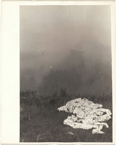 Editor: This gelatin silver print is titled "Chinese cemetery—San Francisco" by Robert Frank, created in 1956. The scene is quite bleak and muted. I’m curious about how Frank uses composition to create such a somber mood. What catches your eye in this piece? Curator: I find the stark contrast compelling. Notice how Frank uses the geometry of the grave itself—the wooden frame, the decaying wreath—to create a strong foreground. The lines draw our eyes upward toward the soft, diffused background. It's a very deliberate compositional strategy. How do you perceive the relationship between these stark contrasts of dark/light and near/far? Editor: I see what you mean. The dark foreground definitely feels very grounded and weighty, while the misty background almost dissolves. It is dreamlike in that the ground is sharply defined, yet our perception stretches to an ethereal space beyond. Curator: Exactly. Now, consider the texture. Frank is known for his use of grain and his high contrast style. In this piece, where do you see evidence of that texture working most effectively to enhance the image’s meaning? Editor: I think the rough texture of the dirt and the decaying wood contrasts strongly with the hazy softness of the trees and the mist. It emphasizes the decay and temporality of the grave in contrast to nature that endures, almost as an idea. Curator: Precisely! And what effect does that temporality evoke, do you think? Editor: It adds to the sense of melancholy and perhaps a commentary of life’s brevity against an enduring background. The structural forms point to themes beyond merely seeing. Curator: An astute observation. The power of Frank’s work lies in his ability to distill complex themes through careful attention to form and composition, to suggest more than he directly depicts. I learned even more from that observation; thank you!