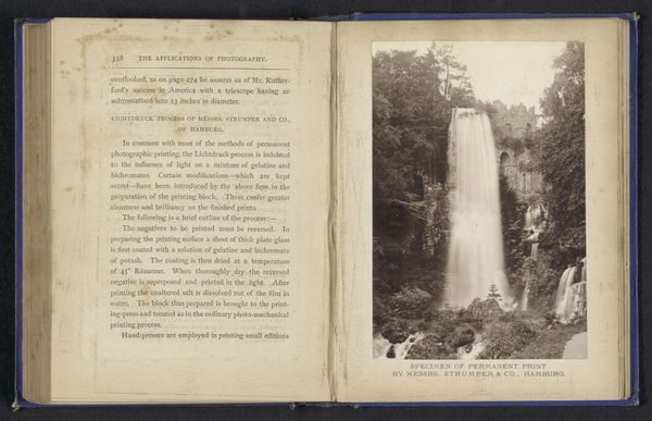 Editor: Here we have Carleton Watkins’ "Gezicht op de Nevadawaterval in de Yosemite Valley," a photograph from before 1868. What strikes me most is the almost theatrical framing of the waterfall by the cliffs – it’s as if nature itself is staging a dramatic performance. How do you interpret this work? Curator: This photograph evokes the sublime, doesn't it? The falls are like a visual metaphor for the unstoppable force of nature, something far beyond human comprehension. Notice how the small figures atop the cliffs underscore this sense of scale and our place within it. Can you imagine what symbols the waterfall may bear to those settlers moving West? Editor: I see what you mean. The tiny figures really highlight how immense the landscape is. But what symbols specifically would stand out to those early settlers? Curator: Think about what a waterfall *means*. It's a source of water, essential for life, and visually, the relentless downward flow suggests purification, renewal, and the passage of time itself. For settlers facing an unknown future, it might have been read as a sign of hope, of continuous support in a challenging journey – or perhaps a warning of nature’s volatile potential. Does the sepia tone alter how this is conveyed? Editor: Interesting. The sepia tones add a sense of timelessness, almost romanticizing the scene, maybe even muting that volatile potential you mentioned. Thanks, that gives me a new perspective on landscape photography. Curator: Indeed, the Hudson River School sought to ennoble landscapes through symbolism. Consider how the addition of human figures may highlight nature’s importance within society, a cultural moment preserved by visual signs. A fruitful exchange.