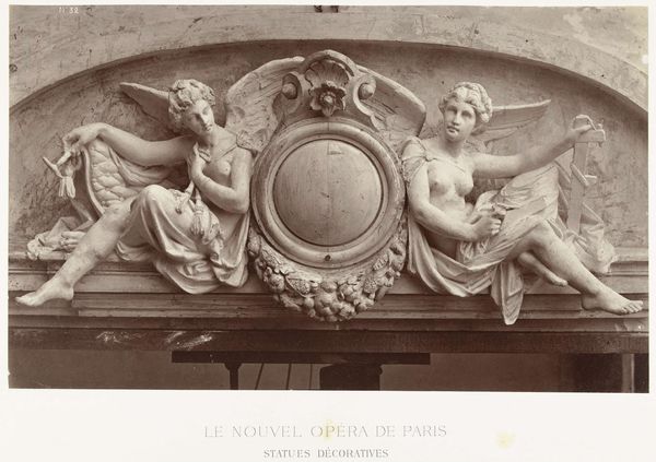 Louis-Emile Durandelle created this photograph of bronze sculptures, sometime during his career. Durandelle was a 19th-century French photographer known for documenting the construction of Parisian landmarks, like the Opera Garnier. Consider these winged figures. Their idealized forms reference classical art. The brawny physique contrasts with the ethereal nature that we might expect from an angel. These figures, with their exposed torsos, hold industrial tools such as a cog and a hammer. This signals the changing social and economic landscape of late 19th-century Paris. It suggests a fusion of traditional and modern values. Masculinity, labor, and divinity merge. The artist creates a modern mythos of the industrial age. This image is a reminder of our constant negotiation between tradition and progress. It also evokes a sense of wonder at the scale and ambition of human creation.