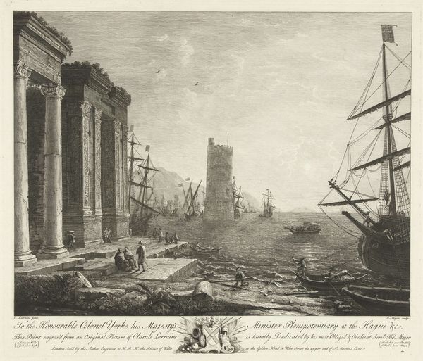 This seaport scene was created by Richard Earlom around 1774, using etching and engraving techniques. These processes involve coating a metal plate with a waxy ground, then drawing through it to expose the metal. Acid is then applied, biting into the metal where exposed. The plate is inked and printed, transferring the image to paper. Earlom's skilled manipulation of line and tone creates a vivid contrast between the architectural ruins on the left and the bustling activity on the right, and his combination of etching and engraving adds depth and texture to the print. The etching likely established the broad outlines and tonal areas, while the engraving added finer details and sharper lines. Prints like these were crucial for disseminating images widely, acting as a kind of proto-photography. They speak to the rise of a print culture, where images could be circulated and consumed on a mass scale. The labor-intensive nature of etching and engraving reflects a pre-industrial mode of production, yet also hints at the increasing commodification of art through printmaking. Understanding these processes and the social context is key to appreciating the layers of meaning embedded in the image.
