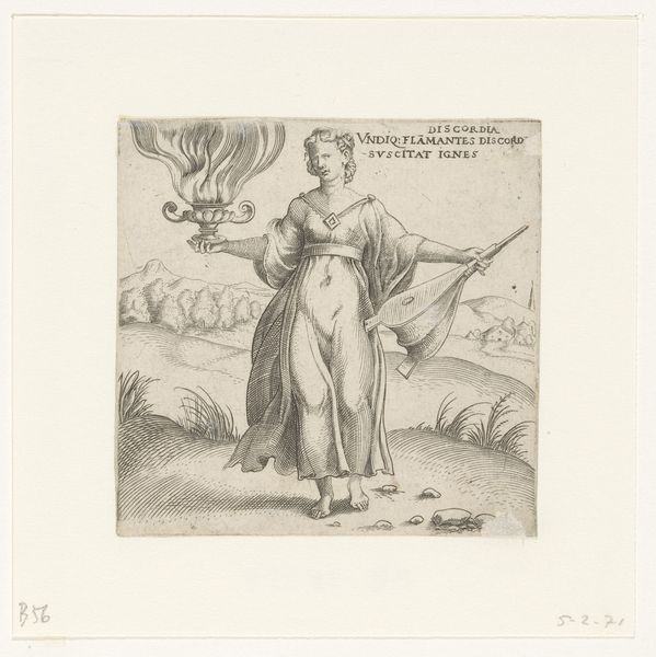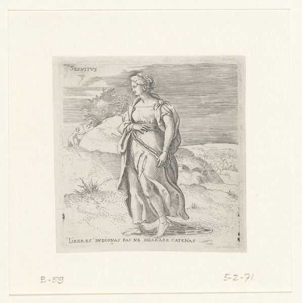 Curator: This engraving is titled "Melancholie," made by Enea Vico sometime between 1533 and 1567. It resides here at the Rijksmuseum. Editor: The figure exudes profound despondency. The overall tonal value is light, almost stark, lending it an air of detachment, don't you think? Curator: Precisely. Vico’s technique is evident in the refined linear quality. Observe the detailed hatchwork—its execution articulates both form and texture within this composition. Editor: Look at the way she’s perched on that rock in the middle of the water; one almost feels the weight of her despair physically sinking into the very materiality of the stone. And her clothes seem bulky and impractical, more burden than comfort. Curator: Indeed. We can look to semiotics to find deeper meanings; the distant ship alludes perhaps to journeys or opportunities lost, heightening the sense of isolation. It forms part of a wider visual language within the artwork. Editor: Perhaps that lost journey reflects on Vico’s choices as an engraver? He made copies of others' designs to bring artwork to wider audiences—a method dependent on commerce, yet also on highly skilled handiwork. Curator: That relationship between craftsmanship and commerce would definitely have shaped the work he did. Think about how this piece resonates even now. Editor: I'll admit, that woman and that sea--that’s a vibe I can identify with. All those careful lines, so meticulously made. So melancholy, but still—impressive.