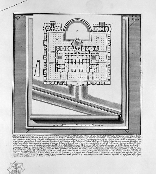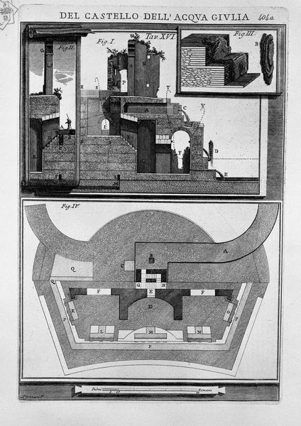 Curator: What a stunning plate from Piranesi's "Roman Antiquities," published in 1756. It depicts the Nymphaeum of Nero, the stadium, the odeon, and temples created by Domitian. All brought to life through etching, engraving, and the precision of architectural drawing. Editor: Immediately, I'm struck by how desolate it feels, even though it's an architectural plan, meant to celebrate structure and order. The stark contrasts of the engraving amplify a sense of grandeur now lost. Curator: Lost indeed, but Piranesi, with his artistic flourishes, offers not just a record but also a palpable sense of the sublime. He presents the vestiges of Roman glory, intertwined with nature claiming its due. The precise lines tracing those ancient structures contrast so vividly with the surrounding topography of the hills. Editor: Right, those carefully rendered geometrical shapes are placed on what looks like an island, isolated and self-contained. Even the lettering seems encased, floating on separate pieces, and adds to the sense of something removed and almost mythological. Curator: Symbolically potent, I think. The "island" shows both preservation and detachment, highlighting ruins. Consider how Piranesi elevates what's ruined to high art! The drawing serves not as an archaeological record but as a stage for historical meditation. He understood ruins speak profoundly about power and mortality. Editor: It makes me wonder about cultural memory, especially what those Roman symbols might have meant in 1756. What continuities did people perceive between the past empire and the present? Was it nostalgia or perhaps a way of understanding present power structures? Curator: Good question, and likely both. This print could have fed the 18th-century fascination with antiquity, as a reminder of past glories or a meditation on how empires rise and fall. Piranesi's work serves as a testament of architectural preservation and as an act of artistic imagination, inviting to see both with fresh eyes. Editor: Absolutely, and thinking about what this imagery has meant through time – architectural record, romantic ruin, meditation on empire – its potency continues. A really compelling blend of artistry and information!