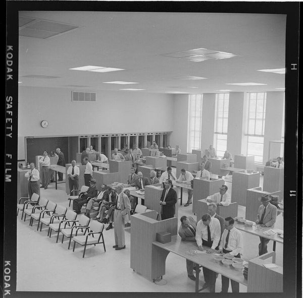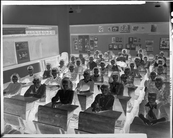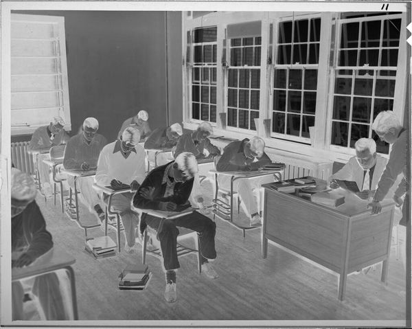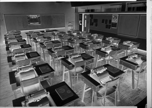Robert Burian’s photographic print, "Untitled (classroom with a typewriter on each desk)", captures a classroom scene frozen in time. The rows of desks, each bearing a typewriter, speak to a specific moment in the history of education and labor. The presence of typewriters – once tools for professional advancement – evokes questions about the changing landscape of work, gender, and access. Typewriting was a female-dominated profession and these machines offered women entry into the workforce, yet they also became synonymous with limiting gender roles. In this image, the ordered rows of desks may be interpreted as a symbol of structure and conformity, echoing the societal expectations placed on women in the workplace during that era. The photograph's stark black and white palette lends it a sense of nostalgia, inviting viewers to reflect on the passage of time and the evolution of technology. It prompts us to contemplate the interplay between individual agency and structural forces, as well as the personal and collective memories embedded within seemingly ordinary spaces.