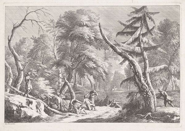 Curator: Today, we’re looking at Daniël (I) Veelwaard's "Figuren in een boot op een rivier," created between 1776 and 1851. It’s an engraving printed on, most likely, laid paper. Editor: The detail in this print is amazing! It captures the dense foliage and the figures in the boat with such precision. It looks quite peaceful. How do you approach interpreting this work? Curator: The emphasis on linear precision dictates that the forms – the boat, the trees – serve primarily to articulate compositional space. Note how the strong vertical lines of the trees are juxtaposed with the diagonal of the boat’s sail, creating a dynamic tension within a contained pictorial field. Editor: That’s an interesting point. I hadn't noticed how the artist carefully uses the contrast between vertical and diagonal lines. So, is it the visual language, rather than any historical or social context that you prioritize? Curator: Precisely. Consider the tonality, achieved through the meticulous layering of engraved lines. Observe the balance and interplay of light and dark, as they establish not only a sense of depth but also structure within the pictorial plane. Are there any parts of the composition that particularly strike you? Editor: The reflections in the water. How much attention Veelwaard dedicates to each distinct reflection depending on its shape and location. They mirror, but with distinct breaks, almost pixelated at the points furthest from the boat and foliage. I had not really seen such precise mark making before. Curator: Indeed, Veelwaard skillfully deploys line work to differentiate textures and create a complex interplay between represented reality and constructed image. It is something I have noticed for quite some time with this piece. It has been an interesting dive into the visual language and its construction. Editor: I see that now. Thank you for helping me look beyond the subject and towards the form! I’ll definitely view engravings differently from now on.