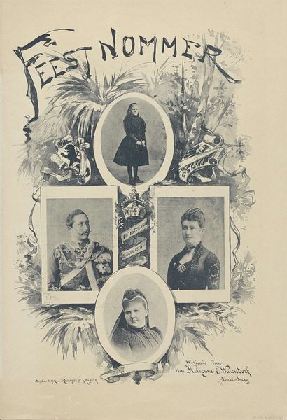 Editor: This is an interesting piece, entitled "Portretten van Wilhelmina, koningin der Nederlanden, en Emma, koningin-regentes der Nederlanden," made around 1897-1899 by an anonymous artist. It's currently housed at the Rijksmuseum. What strikes me are all of the different images and the almost ephemeral quality of the print, resembling an elaborate Victorian collage. How do you interpret the arrangement and its historical significance? Curator: It's indeed a striking visual, isn’t it? Beyond the Victorian aesthetic, it’s crucial to consider the context. Queen Wilhelmina ascended the throne in 1890 at the young age of 10 under the regency of her mother, Queen Emma. The composition, using photographs framed by roses, functions as carefully constructed propaganda. Who is represented here and who is left out? Editor: I see. It is curated. Each image projects an image of innocence and steadfastness for Wilhelmina, while Queen Emma represents a stabilizing, maternal presence. The rose wreaths add a layer of sentimentality... almost masking political ambition. Curator: Precisely. The very deliberate presentation works to legitimize Wilhelmina's reign but also highlights the anxieties surrounding a young woman ascending to power in a patriarchal society. What does it tell us about the performance of gender and power? Editor: It’s as though the creators wanted to ensure they would gain the public’s trust by emphasizing conventional beauty and feminine ideals, perhaps to overcompensate for her unprecedented authority. It also highlights the regent's power; they literally present and frame Wilhelmina's growth into a monarch. Curator: Exactly! So, how can we interpret this visual representation in light of evolving perspectives on gender, power, and representation within the monarchy? Editor: I see it now as a visual strategy that reflects the sociopolitical context and gendered expectations of the time. It reminds us how royal images were meticulously managed to negotiate shifting power dynamics. I hadn't thought of it as active "propaganda." Curator: Thinking critically about historical power structures in play reframes how we can see what seems to be a simple composition of portraits.
