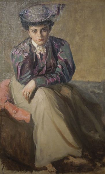 This is Olga Boznanska’s "Portrait of Irena Zbigniewicz née Serda," painted with oils sometime in the late 19th or early 20th century. What immediately strikes us is the subdued palette, a symphony of greys and browns, which creates an atmosphere of quiet introspection. The subject emerges from a diffused background, her form softened by delicate, almost hazy brushstrokes. Boznanska’s technique invites us to consider the artwork's structure: how do these muted tones and diffused forms challenge our perception? The portrait destabilizes traditional notions of representation, suggesting that identity is not fixed but fluid, always in the process of becoming. Notice how the texture and light interact, creating a sense of depth and dimensionality that draws us into Irena's world. Consider, too, how the composition—the gentle tilt of the head, the soft focus—contributes to the overall mood of pensive reflection. Through the formal elements of color, texture, and composition, Boznanska achieves a visual language that speaks to the transient nature of existence and the ever-changing play of light and shadow in our perceptions.