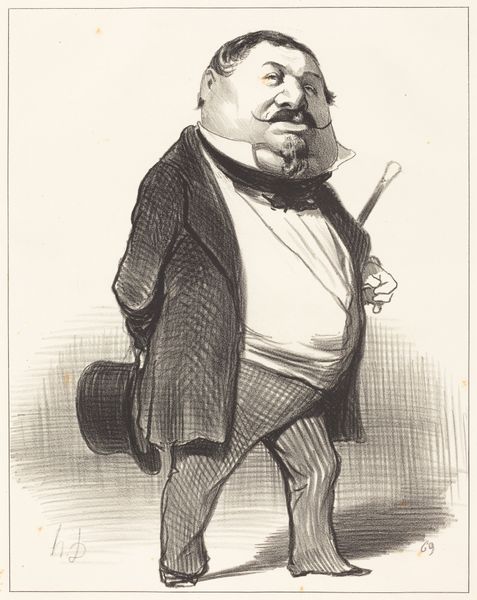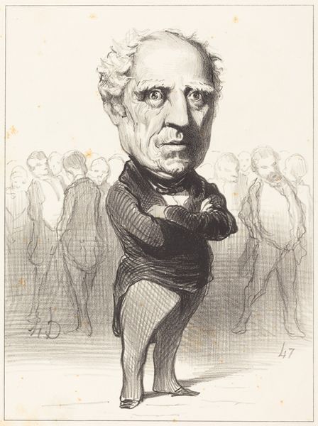 Curator: So, we have here a lithograph by Honoré Daumier, created in 1849. It’s titled "Gustave Sautayra." Editor: Ah, first impressions? Definitely somebody who believes in the sound of his own voice. And the style…is it just me, or does it have that courtroom-sketch vibe, with a twist of operatic drama? Curator: Precisely! Daumier was a master of capturing character through caricature. Note how he exaggerates Sautayra’s features, almost as if inflating them to match his perceived self-importance. The head dominates the body, which itself is stiff, arms crossed tightly. Editor: It's the body language, isn't it? The pose practically shouts, "I have all the answers." And those shadowed figures lurking in the background – are they his captive audience, or maybe his anxieties? Curator: A bit of both, I think. Daumier was deeply invested in the political and social realities of his time. This piece likely critiques the bourgeoisie. That gaze is really something—it's as if he's peering down his nose at everyone and everything. The lithographic technique lends itself well to this, that fine hatching creates shadows that give him an air of menace. Editor: True, but the sketchiness also gives it a sense of immediacy, doesn’t it? As if Daumier dashed it off during a particularly outrageous speech. It is hard to look at that confident, almost comical, character and not make judgements. I keep wondering about the backstory Daumier imagined for Sautayra, who was he REALLY picturing in his mind? Curator: What strikes me is how this resonates even today. The figure is stuck up. You still see the "Sautayras" everywhere – those figures convinced of their own brilliance, blocking progress with arrogance and bloviating language. Daumier gives us an unflinching and unfortunately enduring critique. Editor: So true! It seems to distill universal truths about vanity and the perils of power. Even beyond a single name and date. Curator: Well, I certainly see him strutting the stage—thanks for your thoughts! Editor: Absolutely. This piece truly speaks—or rather, bellows.