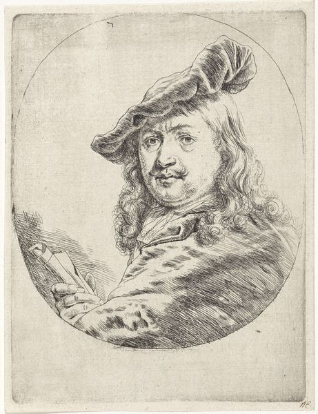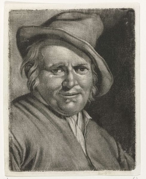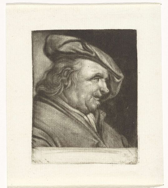This is Jacob Toorenvliet's etching, ‘Het Gevoel’. The print employs delicate lines and tonal gradations to construct a scene dominated by the soft, sensuous rendering of the subject's face and garments. Note how the composition guides our gaze toward the subject’s expression. The hat and fur collar create a frame, focusing attention on the subtle smile and sparkle in his eyes. The texture of the fur and fabric is rendered with remarkable detail, contrasting with the smoother surfaces of the face and goblet. The careful arrangement of light and shadow emphasizes volume and depth. Consider how this interplay of texture and light infuses the scene with a tactile quality, appealing to the senses and inviting a closer look. This is not merely a portrait but an exploration of feeling itself, distilled through the artist's masterful handling of line and tone. It invites us to engage with the complexities of human emotion.