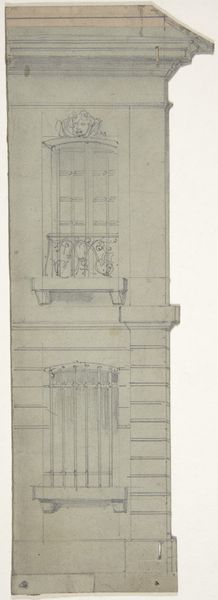 Curator: Here we have "Design for a carved pillar next to a doorframe," an architectural study rendered in pencil, dating from sometime between 1800 and 1900. Editor: It's so precise, almost ghostly in its clarity. Like an echo from a grand hall or maybe the whisper of a building that never came to be. I can almost hear the distant tapping of a mallet against stone. Curator: Yes, the medium conveys a sense of meticulousness. Notice the cross-hatching, indicative of depth, the subtle variations in line weight suggesting different textures and planes, the geometric arrangement. Semiotically, the pillar signifies order and permanence. Editor: Permanence, definitely. Yet, because it’s just a sketch, it’s fleeting too. I mean, all the curlicues and ornamentation—they're extravagant, but there's a melancholy air about them too, a wistful look into another time. The incompleteness. It leaves you wanting the artist's vision for color or any possible additions, what could have been and how the sunlight would have touched the work, finished. Curator: Indeed. The architectural language employed speaks volumes, does it not? The Corinthian capitals, though sketched, denote classical ideals. The rendering captures a transition in architectural design towards Neoclassicism. It presents a vision of ordered space. Editor: A space that needs some nature too, it feels. The pillar cries for some vibrant life like trailing vines. That rigid form wants some rebellious nature poking out and taking over to disrupt those geometries, right? It is almost as though these are all plans and no spirit and yet, looking closely at each line, there’s so much care. That human hand. Curator: Precisely! A dialogue, perhaps, between intention and form, freedom and function. Editor: A quiet ghost of possibility. A grand idea, simply caught.