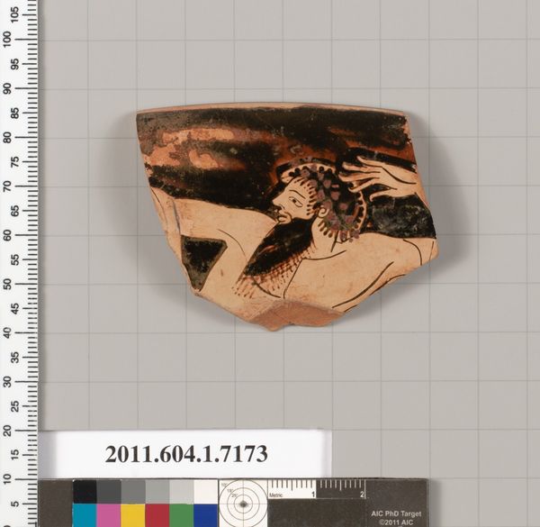 Editor: This is a fragment of a terracotta kylix, a drinking cup, from around 530 BC. It’s currently housed in the Metropolitan Museum of Art and attributed to Makron. I am really struck by the graphic quality, the black and red contrasting against the ceramic, and the lines still manage to suggest dimension. How would you interpret the imagery? Curator: Well, right away I'm drawn to the hand. Think of hands as conveyors, linking inner thoughts to outer actions. Here, the elegant fingers might suggest a delicate touch, perhaps accompanying music or poetry recitation at a symposium, for which kylixes were common. Editor: Symposiums, as in, drinking parties? Curator: Indeed! So, how might the imagery of the kylix, in these fragmented pieces, function at these symposiums, what role might it have in evoking memory, celebration, and perhaps even social cohesion within the group? What about the instrument? Do you know which one it is? Editor: It looks like a tympanon, like a small frame drum? Curator: Precisely. And think about its presence – rhythm, trance, and perhaps, connection to Dionysus. That hand may also symbolize that god. The Greeks always told stories in their paintings. And by doing that in these little vessels, they carry messages through centuries of symbol decoding, for us to see, like an ongoing, immortal conversation! Editor: I didn’t even think about it representing a God, and these everyday objects told an on-going narrative through time! So insightful, thanks!