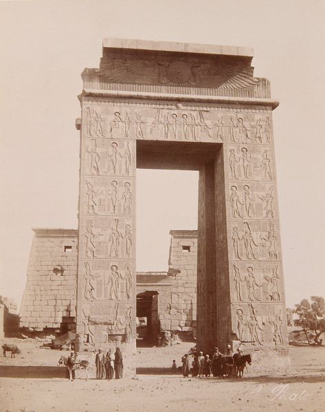 Curator: This haunting landscape is a photograph by Félix Teynard, created between 1851 and 1852. The piece is entitled "Karnak (Thèbes), Vue Générale des Ruines Prise du Point B." It captures a general view of the ruins at Karnak in Thebes. Editor: Wow, instantly, I feel transported. It's almost bleached, this scene, incredibly desolate, and utterly mesmerizing. It has this quiet intensity that draws you in close, doesn't it? Like a half-forgotten dream. Curator: Absolutely. Teynard’s work here, part of an extensive project documenting Egypt, provides invaluable insight into 19th-century archaeological and colonial contexts. This photograph allows us to reflect on the power dynamics inherent in the act of documenting and claiming ancient sites. It’s very much an act of asserting influence and ownership, especially as Egypt was of interest to different imperial powers at this time. Editor: It also makes me consider our own relationship with time, and ruins, with memory. What's left when empires crumble? These stone giants... they stand so proud but time marches on. Is Teynard implying this? The composition, with its stark sky, just accentuates that impermanence. Curator: Precisely! Teynard’s technical choices also speak volumes. The use of early photographic processes and his compositional strategies emphasize both the grandeur and the decay, highlighting the complexities of cultural heritage and preservation efforts of the period. Note the scale; even these mammoth structures seem small under that immense sky. Editor: The foreground’s almost prickly—there's these clumps of vegetation which is quite arresting, actually—bringing a bit of earthly groundedness, a reminder that life, albeit stark, persists amidst all this faded glory. I see such drama in the contrast. I find I'm thinking less about the academic implications and more about pure wonder. What secrets do these stones hold? Curator: That sense of wonder is exactly why this image continues to resonate. And if you listen closely, maybe the stones will share their secrets, if we contextualize them within a history of exploitation. Teynard offers us the means. Editor: Oh yes! Thank you for guiding me.