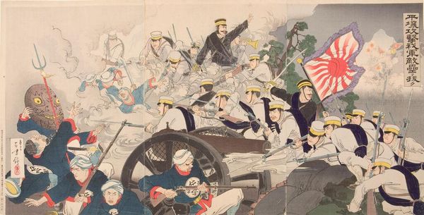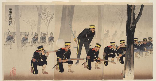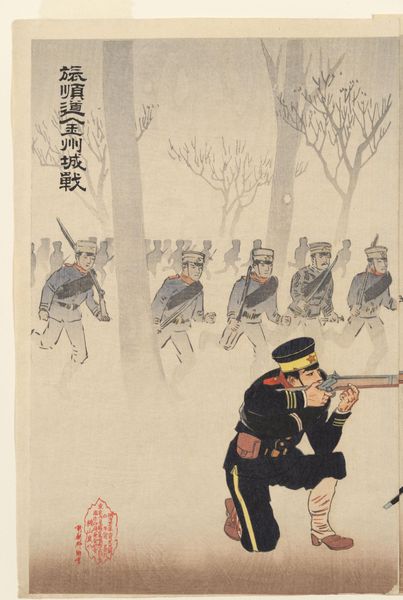 Curator: This is Kobayashi Kiyochika’s woodblock print, "Braving the Snow, Our Troops Capture the Stronghold at Weihaiwei." It's a vertical oban, about 14 by 9 inches, currently residing at the Harvard Art Museums. Editor: It's stark. The monochrome palette, punctuated by the red of what I presume is blood, creates a chilling atmosphere. There's a real sense of struggle depicted. Curator: Indeed. Kiyochika was a master of light and shadow in his prints, often using them to convey the mood of a scene. The falling snow, achieved through meticulous carving and printing, enhances the bleakness. Editor: Knowing that Kiyochika witnessed the transition of Japan into a modern, militaristic nation, I find this work speaks volumes about the complexities of national identity and the human cost of imperial ambitions. The vulnerability of the fallen soldier contrasts starkly with the regimented advance. Curator: Absolutely. The printmaking process itself—the labor involved in carving each block, the layering of colors—reflects the effort and resources invested in these military campaigns. It really underscores the industrial aspect of warfare. Editor: It is difficult to look at, but important to consider the intersectional narratives here, the complex layers of identity, nationhood, and the impact of conflict. Curator: Precisely, a potent reminder of the intertwined nature of production, conflict, and national identity. Editor: A truly sobering piece that leaves one contemplating the narratives we construct around war and sacrifice.