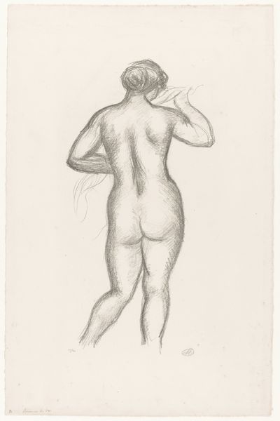 David-Pierre Giottino Humbert de Superville created this chalk drawing titled 'Standing Female Nude, with Raised Right Arm' around 1803. At first glance, the raised arm might evoke a sense of triumph, a victorious gesture we see echoed through ancient sculptures of Nike, the goddess of victory. Yet, the subtle downward tilt of the head introduces a note of introspection, a pause in the celebration. Consider the gesture of the raised arm as it echoes through time, finding its way into religious iconography, signaling divine inspiration or supplication. The connection between these gestures isn't always linear; instead, it meanders through the collective unconscious. This drawing captures a moment of human experience, an instant we intrinsically understand. It reminds us that symbols are not static but living entities that evolve with the ever-changing human experience.
