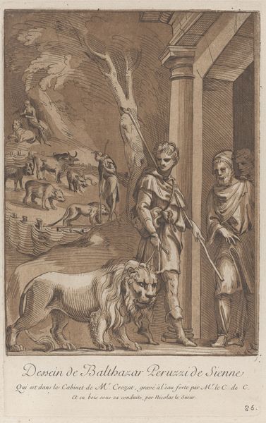 Martin Desjardins’ drawing features Hercules wrestling Antaeus, set against a backdrop of formidable lions and rocky terrain. Here, the struggle between the mythical strongman and the earth-bound giant unfolds, a powerful tableau reflecting humanity's eternal battle against primal forces. The lions, symbols of strength and sovereignty, flank the scene, embodying a guardian-like presence over this elemental confrontation. This motif of wrestling heroes has ancient roots. We see echoes of it in Mesopotamian cylinder seals, depicting Gilgamesh grappling with wild beasts. The symbolism transcends epochs. Consider the Laocoön group, where a father and sons are entwined in a deadly struggle with serpents, both capturing the agony of human vulnerability. In Desjardins' fountain design, the twisting bodies of Hercules and Antaeus evoke a similar sense of raw emotion. The emotional intensity of this scene has been continually echoed throughout history, reminding us of the universal, deeply rooted anxieties of human existence. The power of such images lies not only in their symbolic content but also in their capacity to evoke the depths of human experience.