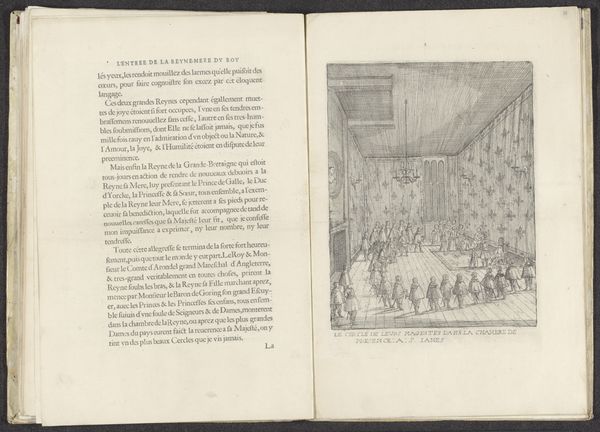 Curator: Let's examine "Maria de' Medici ontvangt de Lord Mayor van Londen," an engraving from 1639. The print depicts a historical event, offering insight into courtly interactions. Editor: The immediate impact is the strong, almost oppressive use of line work. It’s incredibly detailed, yet confining; a stark contrast to the grandeur one might expect from such a scene. The space feels almost boxy. Curator: Indeed, the medium and style—a line engraving produced during the Baroque period—dictates much of that visual effect. This was likely a reproduction for wider distribution, thus speaks to the availability and consumption of images illustrating power dynamics at the time. Editor: Precisely. The use of linear perspective draws our eye, but the lines themselves flatten the subjects, diminishing any real sense of depth. Observe how the interplay between the figures creates rhythm throughout the room, echoing the courtly etiquette portrayed. Curator: From a materialist perspective, it’s interesting to consider the role prints like these played in solidifying Maria de’ Medici’s image and authority across geographical boundaries. The accessibility of prints meant that idealized representations of power could circulate widely. Who commissioned this work? What was their intent in the distribution of this depiction of courtly proceedings? These are crucial points in assessing its value. Editor: I’m more intrigued by the visual encoding of power within the composition itself. Notice how Maria de' Medici is positioned on a dais, elevated and central. The Lord Mayor and his entourage appear almost as secondary players, arranged for visual consumption by her. Curator: Don't forget the social context—prints of this type are indicative of larger workshop and patronage systems. It’s not solely about what’s depicted, but who had the resources and the access to create and distribute the image, thereby controlling the narrative. Editor: A potent reminder. The meticulous lines reveal the labor, yet obscure its larger ramifications of the socio-economic impact that is less apparent on the surface, wouldn’t you say? Curator: Absolutely. Analyzing this print compels us to question the systems of labor involved in image-making and their link to reinforcing established hierarchies. Editor: And for me, the lines and careful rendering evoke this same idea of hierarchies and power—in pure visual form. A fascinating conversation this piece initiates.