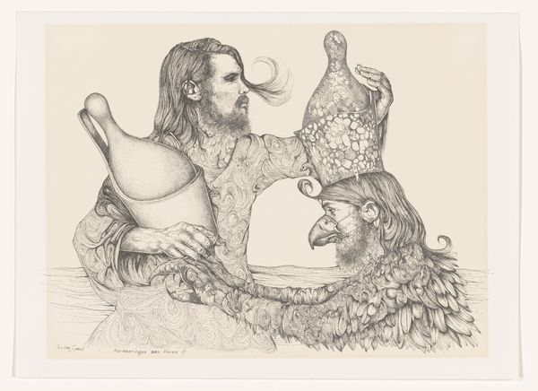This is Hans Thoma's 'Ex libris August Rasor', an etching intended as a bookplate, but its symbolic content goes far beyond mere identification. Made in Germany, this print presents a peculiar scene: a bearded merman emerges from the waves, struggling to hold aloft an enormous clamshell in which two cherubic figures play. It's a curious blend of classical and romantic imagery. The merman may be a nod to ancient mythology, while the cherubs evoke a Renaissance sensibility, all combined with the late nineteenth-century German interest in folklore and the mystical. Such imagery reflected the cultural milieu of the time. Germany was undergoing rapid industrialization, and art often provided an escape into a world of myth and legend. Bookplates, in particular, became a marker of personal identity and cultural refinement for the rising middle class. To fully understand this artwork, scholars might explore the literary and artistic trends prevalent in Germany, focusing on the revival of interest in classical and mythological themes.
