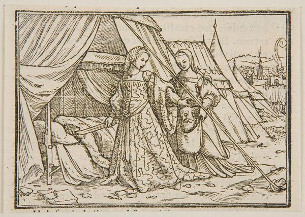Curator: This is Hans Holbein the Younger's "Song of Solomon I," held at the Harvard Art Museums. Editor: It has a raw, almost woodcut feel. There's a simple narrative, but the stark lines give it a weight. Curator: Indeed. Holbein's mastery lies in the precision of his lines, despite the apparent simplicity. Observe how he uses hatching to model forms and define textures within a compressed pictorial space. Editor: And it speaks to a specific moment—the production of imagery for mass consumption. This wasn't some precious painting, but a replicable image, potentially for a book. It's tied to labor, craft, and accessibility. Curator: The composition itself is masterful, directing the viewer's eye through a series of carefully placed figures and architectural elements that serve a representational structure. Editor: Right, and thinking about that production—who made the paper, who cut the block? How did this image circulate, and what audience did it reach? Curator: A fascinating intersection of artistic virtuosity and the burgeoning print industry. Editor: It makes you appreciate the layers of meaning embedded within such a seemingly simple scene.