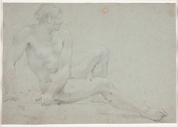 Editor: Here we have a pencil and charcoal drawing titled "Halvtliggende model. Set fra ryggen…," which translates to "Semi-reclining model, seen from the back…" It was created sometime between 1778 and 1809 by an anonymous artist. What strikes me is the tension in the figure – a beautiful, classical form, yet somehow constrained. How do you interpret this work? Curator: The title already gives so much away, doesn't it? *Seen from the back*. Immediately we become voyeurs, participants in some secret observation. Notice how the artist hasn’t just shown us a body, but a study of strain – the figure is pulling against something we can’t see, hand gripping what appears to be a rope. Editor: Yes, it almost feels like a struggle. But what is it about, exactly? Curator: Perhaps a physical struggle, certainly. But consider also the academic tradition, the hours of posed stillness, the artist wrestling with the form itself. There's a sensuality too, in the way the light falls across the back and limbs. It’s a study in contrasts, this tension between the idealised form and the very real sense of effort and constraint. Editor: It makes you think about the effort that goes into creating art. Curator: Precisely! And maybe, on a deeper level, it's about our own struggles to reconcile our inner selves with the external world. Don't you think? Editor: I think I do. Thanks for pointing out that tension; it definitely brings new meaning to the drawing.