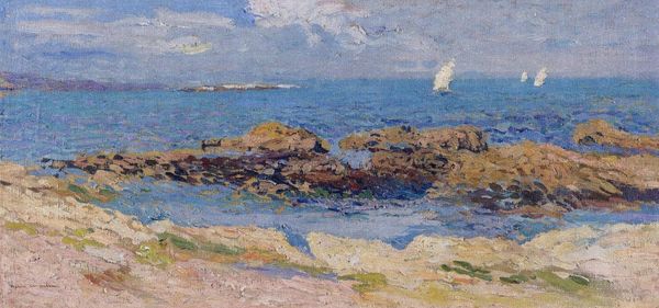 Curator: Henri Martin’s oil painting, titled "Sailboats near the coast," invites us to contemplate the intersection of land, sea, and sky. It captures the essence of a serene coastal scene, rendered in a distinctive Impressionist style. Editor: There's something immediately soothing about this. The colors, a blend of muted blues, creams, and sandy browns, create such a gentle atmosphere. I feel as though I could just walk into it, barefoot, and sit on those rocks and watch the sails disappear. Curator: The sailboat has long been associated with journeys, exploration, and the human desire to navigate the unknown. Martin's depiction, impressionistic as it is, taps into that deeper symbolic language. It hints at human aspirations and perhaps a sense of adventure. Do you agree? Editor: Absolutely, and perhaps also speaks to vulnerability. Those small sails amidst this expanse, it creates a powerful visual tension between fragility and freedom, doesn't it? But more than that, it's how the light dances across the water, the impasto strokes hinting at the sea's restless nature and timelessness. It is beautiful. Curator: Indeed. And notice how the earth, or rather, how the rocks dominate the composition foreground? In some ways it speaks to the resilience and immovability of the rocks, and this contrast is striking with the transient ships far away on the ocean, don't you think? Editor: Definitely. There's a sense of groundedness, a solidity to those rocks that anchors the ephemeral quality of the sea and the fleeting sailboats. The color palette is rather quiet actually. Almost restrained for an Impressionist painting. Curator: Its atmospheric perspective, the technique used to create depth and distance, suggests an endless horizon, inviting the viewer to contemplate the vastness of the ocean, and of course what that symbolizes – change, the passage of time. The ships disappear into the infinite, with this melancholic touch… Editor: Precisely. It's more than just a pretty seascape; it's an invitation to get lost in thought. It makes me think about all the possibilities. So thank you, Henri Martin, for making me feel again.