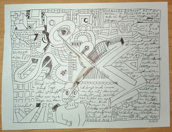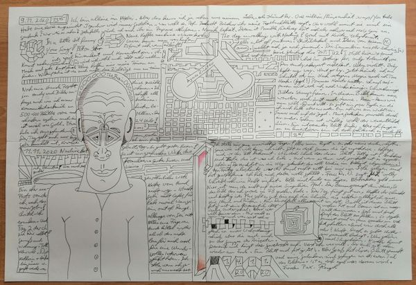 This is "Nr 14" by Armin Andreas Pangerl, made with ink on paper. The artist was born in 1965. This drawing is densely packed with text, geometric shapes, and figurative elements. It can be viewed as a deeply personal and emotional document, reflecting Pangerl’s inner thoughts and experiences. The text, a mix of observations, feelings, and cultural references, provides a stream-of-consciousness glimpse into the artist's mind. The juxtaposition of German text with English phrases like "Every breath you take! Sting" adds another layer, hinting at cultural influences and perhaps a sense of displacement or hybrid identity. The recurring theme of confinement, both literal and metaphorical, resonates with a sense of struggle and perhaps a critique of societal constraints. Pangerl seems to be engaging with a world that is both intensely personal and broadly social.
