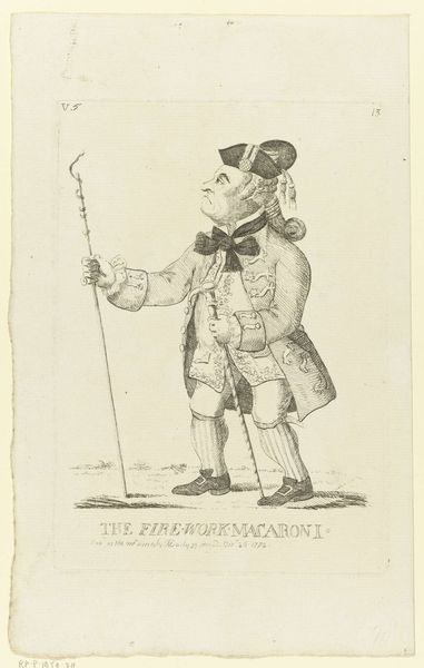 This engraving by Charles Grignion, titled "Macaroni at a Sale of Pictures," presents a curious figure rendered with meticulous lines and shading. The composition is dominated by the central figure, a so-called "Macaroni," whose elaborate attire immediately draws the eye. Grignion uses line and form to emphasize the Macaroni's exaggerated fashion—his high wig, ornamented jacket, and affected pose. The sharp, precise lines define his silhouette against the plain background, creating a sense of theatrical display. The artist uses semiotics to tell a story about this figure and what he represents culturally. The Macaroni, a symbol of excessive European fashion adopted and adapted by young British men, challenges established categories of gender and class through flamboyant self-presentation. The image's cultural critique lies not just in its subject, but in the very act of representation. It encourages us to decode the visual language of fashion and to question the values it embodies. The print underscores how visual culture can destabilize norms and invite critical reflection.
