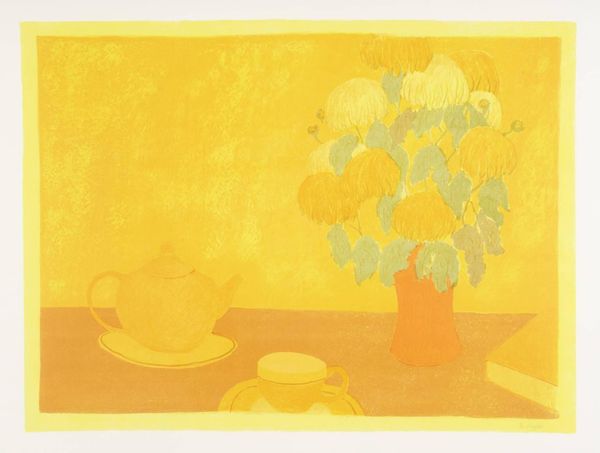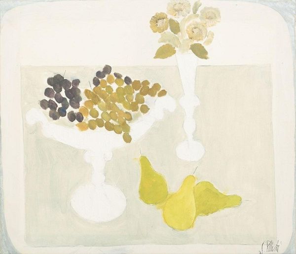 Editor: Here we have Bernard Myers's "Japanese Anemones" from the Tate Collection. It's a calming composition, but the vase seems more like a drawing than a solid object. How do you interpret the symbolism in this piece? Curator: Notice how the ephemeral flowers contrast with the more permanent, though sketch-like, vase. Vases often represent the body, a vessel, if you will, while flowers symbolize transient beauty. What cultural narratives might Myers be exploring here? Editor: Perhaps the tension between fleeting moments and enduring forms, reflecting on our own mortality? Curator: Precisely! The anemones, with their delicate petals, evoke feelings of fragility, while the vase hints at a longing for permanence. It's a visual meditation on the cycle of life, presented through familiar, comforting objects. Editor: I never thought about still life holding so much cultural weight. Thanks for pointing that out! Curator: My pleasure; isn't it wonderful how symbols can speak volumes across time?