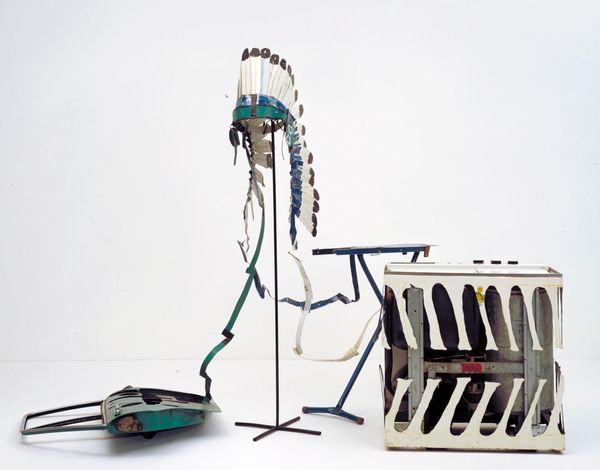 Editor: Barry Martin's "Metal Surface" is a fascinating, kinetic sculpture held in the Tate collection. Composed of various metal components, the piece has a somewhat industrial aesthetic. What structural relationships do you observe within this construction? Curator: The interplay between the static and kinetic elements is quite striking. Note how the rigid, orthogonal framework contrasts with the circular motion of the discs, creating a visual tension. The artist employs principles of balance and counterpoint. Editor: I see that. So, how does the choice of material contribute to the overall impact? Curator: The unadorned metal emphasizes the raw, functional nature of the piece. The surface quality, with its inherent textures and sheens, becomes integral to the sculpture's formal language. What are your thoughts on this? Editor: It makes me consider the mechanics of the machine and the beauty of its design. I hadn't thought about it that way before. Thanks!