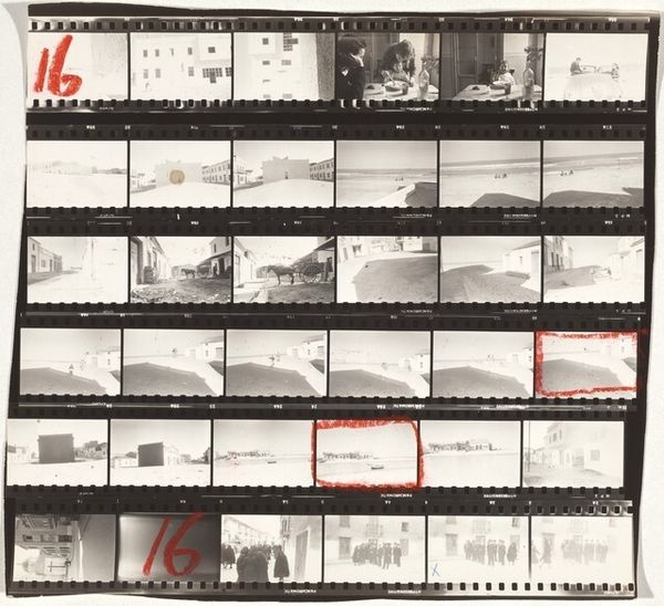 Robert Frank created this contact sheet titled Paris 13B using photographic paper and film. It is part of a larger project that can be understood in relation to institutional and social settings. Frank was a Swiss photographer who traveled to America in the 1950's, a time of social upheaval and change. His work challenged conventional notions of beauty and instead captured everyday life. This contact sheet from Paris similarly reflects Frank's interest in the mundane aspects of the city. The rows of images, preserved as a sequence, allows us to grasp Frank’s working process. It raises questions about how photographers choose images and how that selection process impacts our understanding of the world around us. To better understand Frank's art, one might consult other contact sheets, his published books, or the archives of museums that have exhibited his work. Understanding the social and institutional context helps us better interpret photographs.