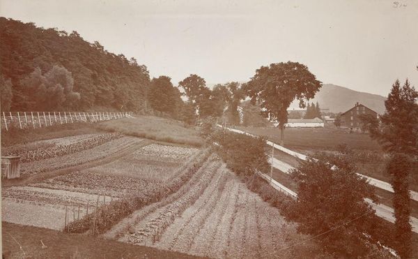 Richard Tepe made this photograph, 'Bakken met begonia's in het park van Paleis Het Loo in Apeldoorn', using a photographic process sometime between 1864 and 1952. Immediately striking is how the orderly arrangement of rectangular flower beds contrasts with the organic chaos of the surrounding trees. This deliberate ordering hints at a core tension: nature versus control. The sepia tone flattens the image, stripping away color and emphasizing form. We see a semiotic interplay: the beds, regimented and neat, act as signs of human intervention, while the sprawling foliage represents untamed nature. This dynamic can be read through a structuralist lens, contrasting binary opposites of order and disorder. Consider the act of framing. Tepe isolates this manicured garden from the wider park, presenting us with a constructed reality. The photograph thus becomes a commentary on our desire to impose structure onto the natural world, a theme that resonates far beyond the garden walls.