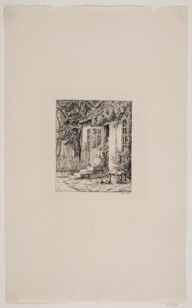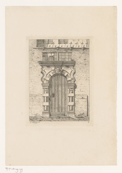 Curator: This is Jean Théodore Joseph Linnig’s “Ingang van het Sint-Julianusgasthuis in Antwerpen,” created in 1868. It's an etching depicting the entrance of a historical hospital in Antwerp. Editor: There’s something starkly beautiful about the muted tones and detailed line work. It gives the scene a realistic, yet somehow melancholic atmosphere. It makes you wonder about the building materials, how they weathered. Curator: Absolutely. The artist captures the textures of the aged stone and brick so effectively, which is not coincidental. This hospital was a significant charitable institution; such institutions played important roles in civic life. How the institution presents itself physically makes claims about its societal status. Editor: It's fascinating to consider this through the lens of the hospital's function. It brings into focus how spaces, even those dedicated to healing, become material embodiments of the values and social structures of their time. You almost get a feeling of their hardship in their very poses. Curator: Precisely. The figures entering seem burdened. Linnig places these individuals, seemingly ordinary citizens, within the architectural context of social care. What this print shows is how buildings impact individual experiences. The setting contributes to the story that the picture is trying to tell. Editor: Considering the material aspects—etching as a medium allowed for precise detail, really lending itself to realistically portraying buildings in their time. This level of fidelity suggests something almost scientific about the way the image was constructed. The buildings materials were there to be captured as honestly as possible, a sense of reality frozen on the copper. Curator: Linnig's piece reveals more than just the architecture. It makes visible, through art, how the act of charity was visibly and tangibly situated within 19th century Antwerp society. Editor: And that very visibility hinges on the material means available to represent that moment, it highlights social stratification, the work needed to etch the image on the plate. So many material decisions end up capturing society itself in that picture. Curator: An image dense with history, a beautiful blend of the personal and the political. Editor: Yes, a convergence of materials and narratives, solidifying its place in history.